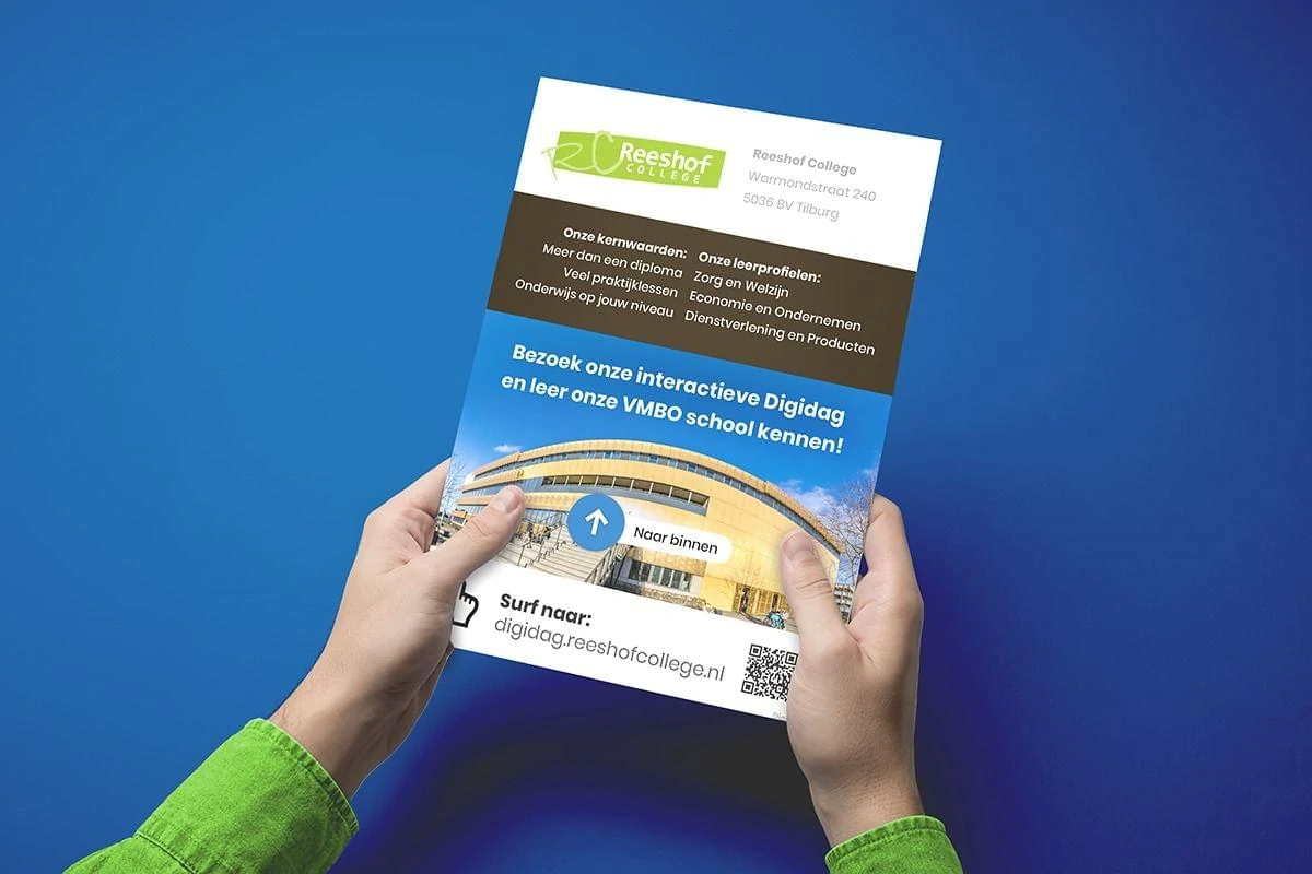 We gaan aan de slag met jullie verhaal. Wat zijn jullie kernwaarden, wat maakt jullie uniek? We schrijven de kernwaarden en de teksten, Aleks gaat aan de slag met de vormgeving en Guido maakt de foto's. Digidag is een interactieve marketingtool waarmee nieuwe leerlingen (en hun ouders) en personeel een goede sfeer kan proeven van wat jullie als school te bieden hebben.